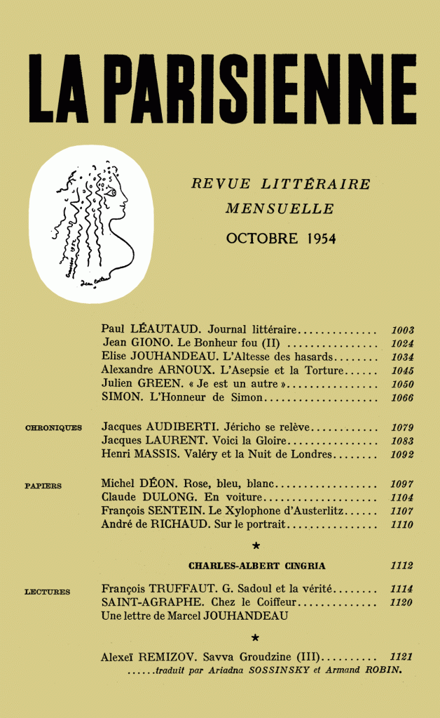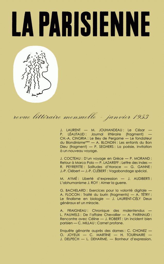 Couverture du premier numéro de La Parisienne (janvier 1953), avec le logo de la revue dessiné par Jean Cocteau et la participation de Paul Léautaud avec des fragments de Journal de la dernière semaine de 1926