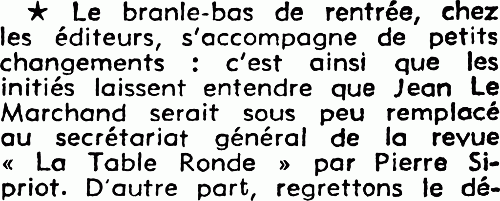 J’ai parlé à François Sentein du départ de Jean Le Marchand comme secrétaire de la rédaction de La Table Ronde, et de son remplacement par Pierre Sipriot. Il me raconte que Le Marchand mettait tous ses efforts à faire de La Table Ronde une revue intéressante, avec des textes intéressants, avec des textes vivants, en désaccord souvent avec la direction, le côté catholique, quelque peu religieux de la maison Plon, maintenant son point de vue. C’était forcé qu’il arrive qu’on ne supporte plus cette attitude.