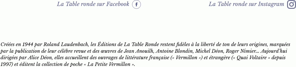 4 Des reproches, parfois virulents (comme quoi le sujet n’est pas si négligeable), ont été fait pour avoir laissé dans cette page le titre La Table ronde avec parfois une capitale à ronde et parfois pas. De nos jours, les éditions de La Table Ronde, qui n’est pas la revue, marquent la capitale à Ronde… mais pas toujours, ainsi que l’indique la copie d’écran ci-dessous effectuée le douze novembre 2025, date de cette note :
