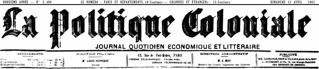 La Politique coloniale, journal économique et littéraire, est paru en 1879, d’abord bi-hebdomadaire puis quotidien. Des textes du poète, romancier, journaliste et historien belge Hector Fleischmann (1882-1913 ou 1914, mort à 31 ou 32 ans) — et peut-être d’autres journalistes — paraissaient le même jour dans ses deux titres sous le pseudonyme de « Jeannine » « votre petite amie très littéraire ».