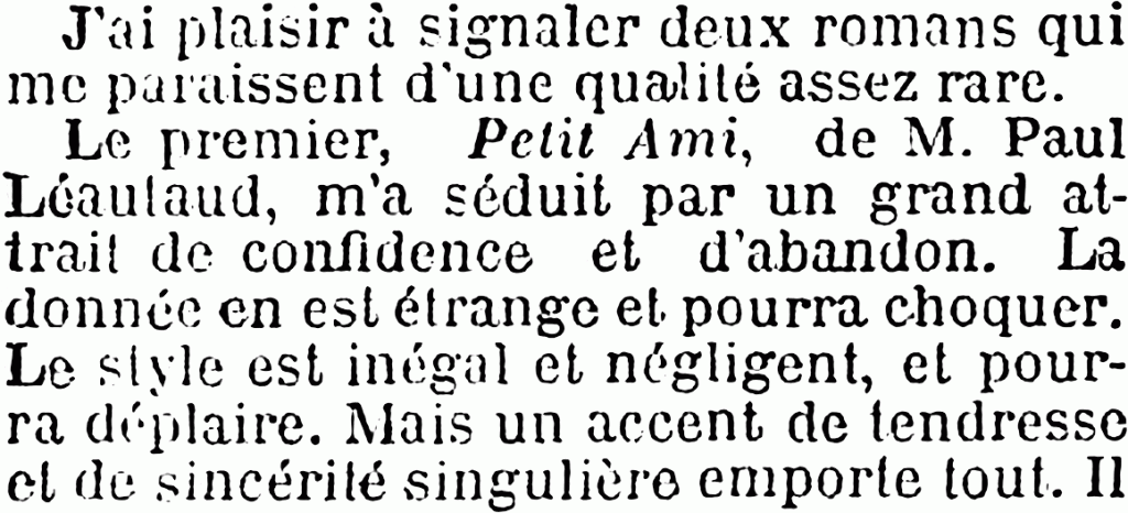 J’ai plaisir à signaler deux romans qui me paraissent d’une qualité assez rare. Le premier, Petit Ami, de M. Paul Léautaud, m’a séduit par un grand attrait de confidence et d’abandon. La donnée en est étrange et pourra choquer. Le style est inégal et négligent, et pourra déplaire. Mais un accent de tendresse et de sincérité singulière emporte tout. Il y a, dans ce roman, cent pages de souvenirs d’enfance qui sont parmi les plus précis, les plus vivants, les plus spéciaux que je connaisse. Et l’on peut y trouver, par surcroît, beaucoup d’histoires charmantes qui ne sont plus tout à fait d’un petit garçon… Livre un peu déconcertant, somme toute, voilé de tristesse et d’enfantillage, écrit au hasard, et tout plein de littérature. Mais son grand charme naît d’une sincérité qui devient parfois gênante par son excès et par une sorte d’impudeur volontaire. Ce sont plus que des confidences, ce sont des confessions. Elles sont si franches, si dévoilées, et en même temps si simples, qu’elles ne plairont peut-être beaucoup qu’à de très jeunes gens, et à des femmes. Mais c’est le public auquel j’aimerais le mieux plaire si j’écrivais des romans. Et j’ai toujours eu un goût particulier pour les livres qu’on sent, comme celui-ci, uniques de leur espèce, et que l’auteur même ne récrira pas.