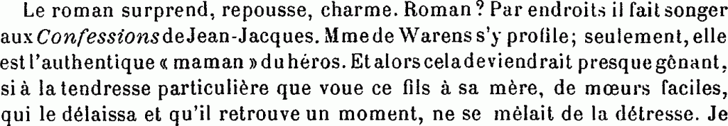 19 Depuis « …imaginez l’histoire d’un être qui serait simplement le fils d’une demi-mondaine » jusqu’à : « il y a là une sincérité, en même temps qu’une inconscience dans la morale qui est toute la base d’un talent. »