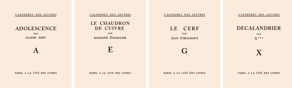 Voici maintenant La Cité des livres, la Collection L’Alphabet des lettres, un écrivain par lettre, pour laquelle Carco est venu me demander quelque chose et dans laquelle j’occupe la lettre L. La première annonce de cette collection a paru dans la Bibliographie d’hier, pour les deux premiers volumes : Claude Anet et Pierre Benoit. Voici le décompte des exemplaires :