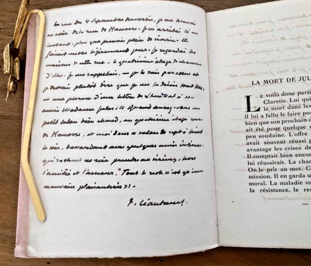 Au printemps 2025 et parue une très intéressante annonce, aussitôt signalée par Maxime : un exemplaire de la lettre L était en vente. Ce n’était pas un exemplaire comme les autres, il comportait un autographe mais ce n’était pas un autographe comme les autres. À la demande de l’acheteur, ou peut-être simplement pour un ami — cet ami pouvant être Sacha Guitry — Paul Léautaud a écrit de sa main sur la page de garde non pas un texte d’envoi mais un extrait de sa chronique dramatique de juin 1919 sur la pièce de Sacha Guitry, Le Mari, la femme et l’amant, cette chronique se trouvant, justement reproduite dans ce volume L de L’Alphabet des lettres.