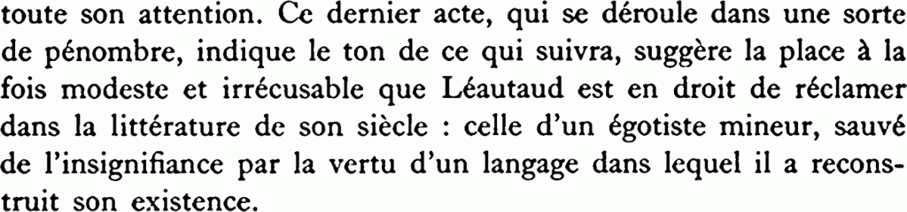 Selon M. Mahieu, voici « la place à la fois modeste et irrécusable que Léautaud est en droit de réclamer dans la littérature de son siècle : sauvé de l’insignifiance par la vertu d’un langage dans lequel il a reconstruit son existence68 », soit, mais en substituant majeur à mineur.