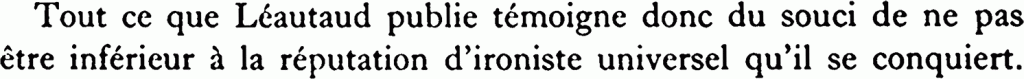 Le premier Léautaud, celui que je préférais, m’a initié à Diderot et à Stendhal comme il y avait initié Remy de Gourmont, et sous ce rapport j’ai à son égard une dette que je ne renie pas. Il n’a pas pu arriver à me détacher de Flaubert, à propos duquel nous nous disputions presque quotidiennement. À propos de qui, à propos de quoi ne se disputait-on pas avec lui ? La plupart des collaborateurs du Mercure qui défilaient dans son bureau pour y prendre leur courrier étaient l’objet de ses sarcasmes et je dois dire que dans ses joutes il avait facilement le dessus.