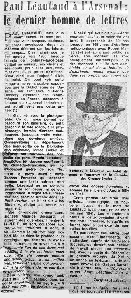 Paul Léautaud à l’Arsenal, par Jacques Jaubert ;