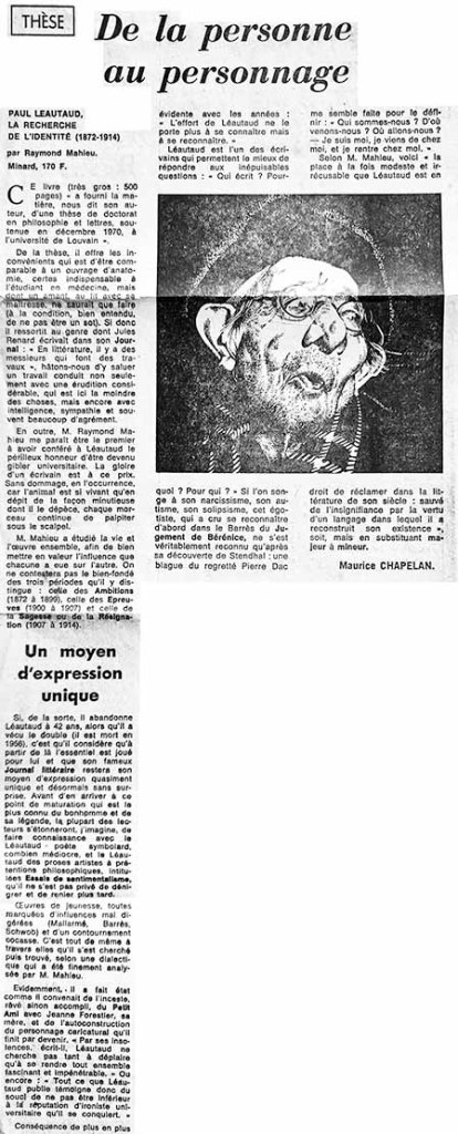 Paul Léautaud, de la personne au personnage, par Maurice Chapelan.