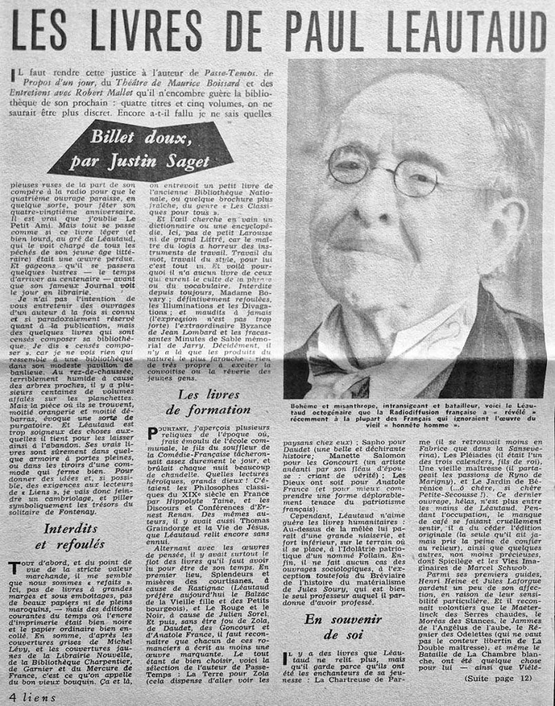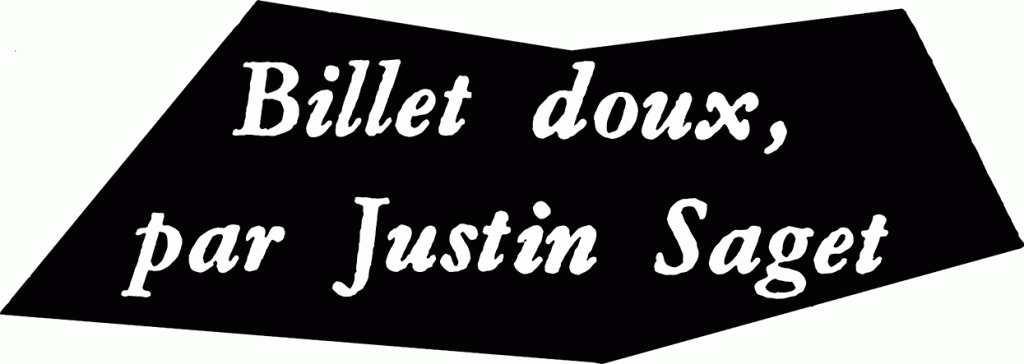 Chronique « Billet doux » de Maurice Saillet (1914-1990) paru dans Combat et signé Justin Saget. Maurice Saillet (1914-1990) est depuis 1938 associé dans la librairie d’Adrienne Monnier, rue de l’Odéon, parallèle à la rue de Condé. Sous le nom de Justin Saget il publie régulièrement dans le quotidien Combat, issu de la Résistance. En 1953 il fondra avec Maurice Nadeau la revue mensuelle Les Lettres nouvelles.
