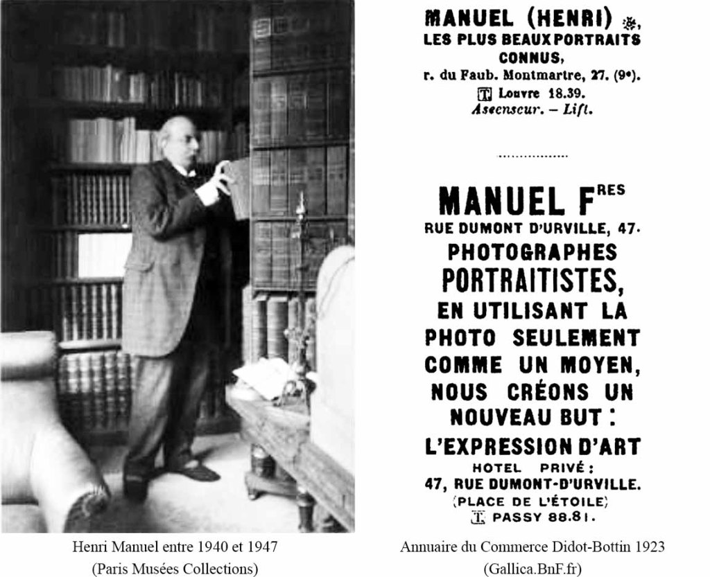 Bien situé près de la place de l’Étoile, no 47 rue Dumont-d’Urville, le studio des Gaston et Lucien Manuel, fondé en 1900, est spécialisé dans le portrait artistique. Leur frère Henri ouvrira son propre commerce en 1913. Bien des personnalités du monde politique, artistique et littéraire ont pris la pose chez eux, comme ici l’auteure Rachilde46 en 1919, épouse du directeur du Mercure de France, Alfred Vallette47, et la célèbre libraire de la rue de l’Odéon, Adrienne Monnier48 :