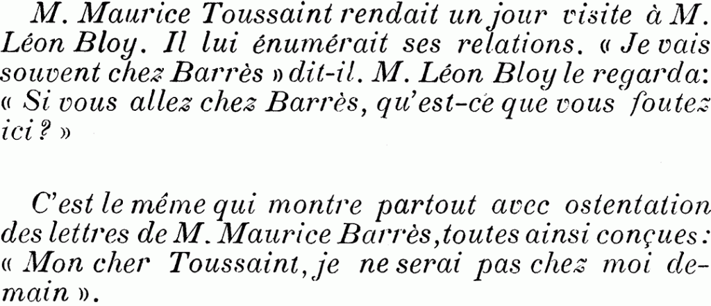 Aussitôt Morisse entré, Mortier s’est précipité sur lui, et lui a dit : « C’est extraordinaire. On parlait justement de vous. Tout à l’heure, on prononçait votre nom devant M. Chéramy4, qui nous a dit : « Ah ! bien. Puisque vous parlez du Mercure, vous allez pouvoir me donner un renseignement. Quand on monte chez M. Vallette5, on trouve toujours deux messieurs. L’un a toute sa barbe, l’autre est complètement rasé. Le premier est extrêmement désagréable, le second est charmant. Qui sont-ils ? » — Nous lui avons répondu : « Le premier est M. Léautaud, le second est M. Morisse. »