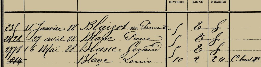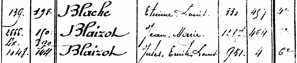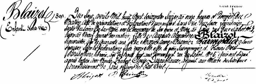 L’enfant est dénommé Parmentier sur l’acte d’état civil, puis sera rayé et remplacé par Blaizot8.