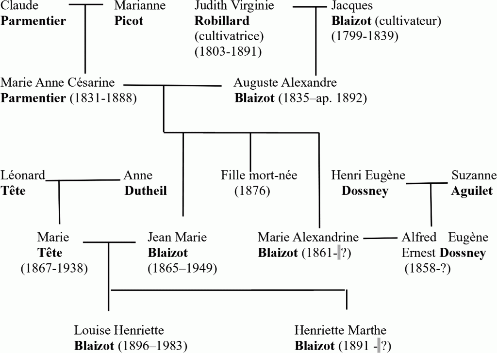 À partir des actes présentés ci-dessus, collectés dans les archives disponibles en ligne, et malgré l’impossibilité d’accès à certains dossiers, nous avons ébauché l’arbre généalogique de Jean-Marie et Louise Blaizot. Il est enrichi de données qui apparaîtront au fur et à mesure de l’avancement du récit.