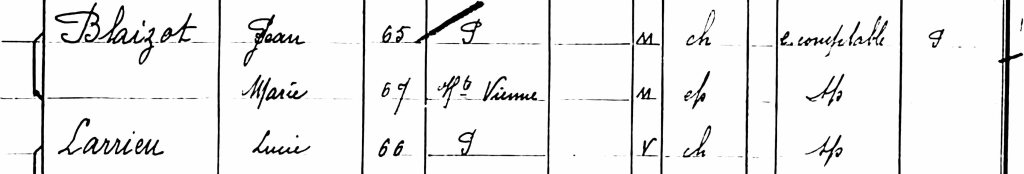 Or, Jean Marie Blaizot — comme ses parents lors du même évènement —, et Marie Tête, avant d’être déclarés unis par les liens du mariage, reconnaissent une fille, Henriette Marthe, née le 20/08/1891, chez la sage-femme qui a assisté à l’accouchement, no 21 de la rue Rousselet, VIIe arrondissement de Paris, et enregistrée comme fille de Madeleine Têthe et de père non dénommé13.
