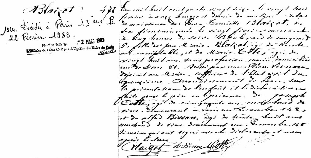 — Une fille, Marie Alexandrine, née le 28/10/1861, déclarée le lendemain à cette même mairie et inscrite par l’officier d’état-civil sous le nom de Parmentier. Elle est reconnue par sa mère le neuf novembre suivant et porte depuis cette union le nom de Blaizot, qui sera ajouté sur son acte de naissance. Précisons que la mère, accouchée par la sage-femme Charlotte Clémence Callés, habite déjà le no 24 de la rue Bonaparte et que son père Auguste est qualifié non dénommé6.
