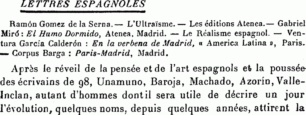 1 À l’évidence, Maurice Martin du Gard n’a pas pris de notes. C’est un an plus tard, le quinze janvier 1921 que paraît la première chronique de « Lettres espagnoles » de Jean Cassou dans le Mercure de France.