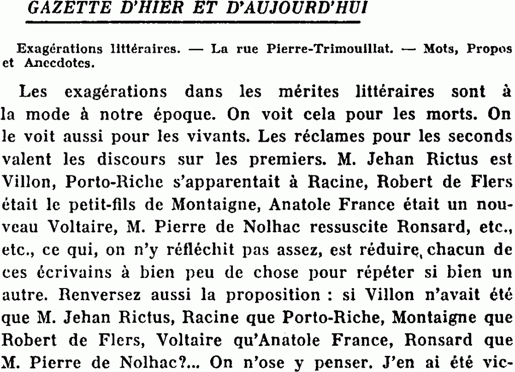 Fragment de la « Gazette d’hier et d’aujourd’hui » parue dans le Mercure de France du quinze août 1933.