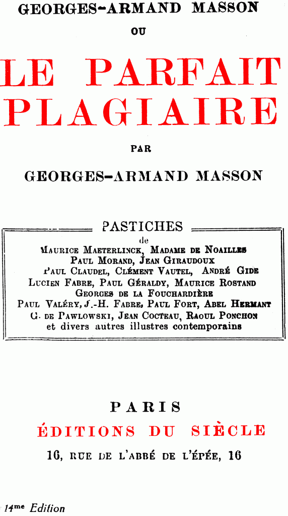 Mais voilà, « un excellent pastiche » c’est autre chose. On pense au Parfait plagiaire, de Georges-Armand Masson, qui comprend des pages amusantes, notamment un pastiche de chronique dramatique qui peut faire sourire, un jour de printemps (et qui sera mis en ligne ici le premier janvier 2024). Du coup on se dit qu’il y a peut-être là un baume qui ira bien sur les propos très extrême-droitiers que nous aurions bien aimé ne pas lire sous la plume de notre ami Léautaud en ces funestes années quarante.