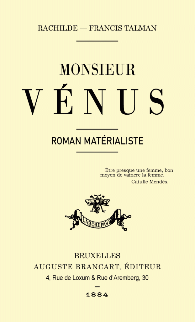 6 Rachilde, Monsieur Venus — roman matérialiste, Auguste Brancart à Bruxelles, 1884. À côté de son nom, Rachilde a inscrit celui d’un Maurice Talman encore inconnu de nos jours et qui n’a peut-être jamais existé.