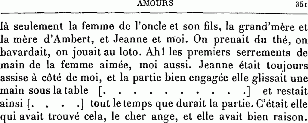 24 Mercure du premier novembre, page 93 : « Elle s’appelait Clotilde, avait quinze ou seize ans, avec un petit visage de sainte Vierge, et était la fille, du reste, d’une vieille bigote de l’endroit. On l’avait prise pour aider ma future belle-mère [Louise Viale] qui venait d’avoir son fils [Maurice], et comme il n’y avait pas de chambre pour elle à la maison, on la faisait coucher avec moi. C’était en 1886, j’avais treize ans. Mon père a toujours eu force chiens, et au moment dont je parle, une chienne venait de faire des petits. Ces petites bêtes étaient gracieuses comme on sait, et souvent Clotilde et moi nous en prenions une ou deux pour coucher avec nous. Or, un certain soir, nous étions couchés depuis un moment, quand étendant la main au hasard, déjà un peu endormi, probablement, je sentis dans le lit un petit corps velu et très chaud. “Tiens dis-je à Clotilde, en me mettant à caresser machinalement, vous avez donc pris un des petits ?” Elle me répondit d’une façon singulière, quelque chose de plutôt soupiré que parlé, et, tout en continuant mes caresses, je sentais ce que je caressais se prêter très bien à ma caresse et me la faciliter, même, en me donnant plus d’espace. Hélas ! on ne s’en étonnera pas, après tout ce que j’ai dit. Des façons si engageantes me laissèrent froid, je restai dans mon erreur sur l’animal, croyant vraiment à un chien, et au bout d’un instant je me retournai dans mon coin pour dormir. »