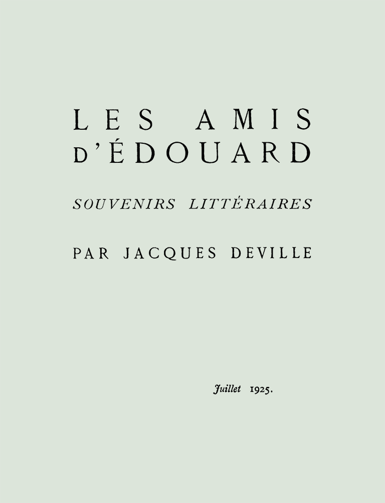 85 Note de Jacques Deville : « Anatole France recevait les petits volumes, les lisait, les aimait… C’est un jour, en louant Édouard et ses amis, qu’il lui dit qu’ils étaient les plus aimables amis du monde : ces mots, Édouard les a placés en exergue de sa collection. »