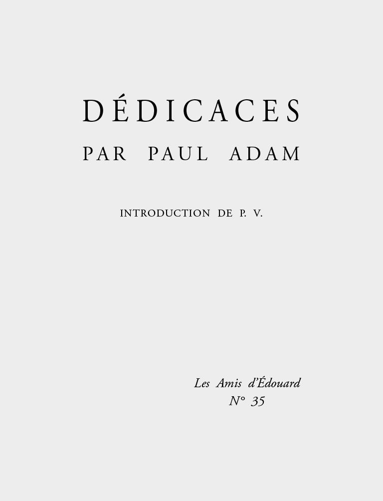 — Parfaitement. — Parmi beaucoup d’autres j’ai les Dédicaces de Paul Adam47, seuls vers connus de l’auteur du Mystère des Foules48.
