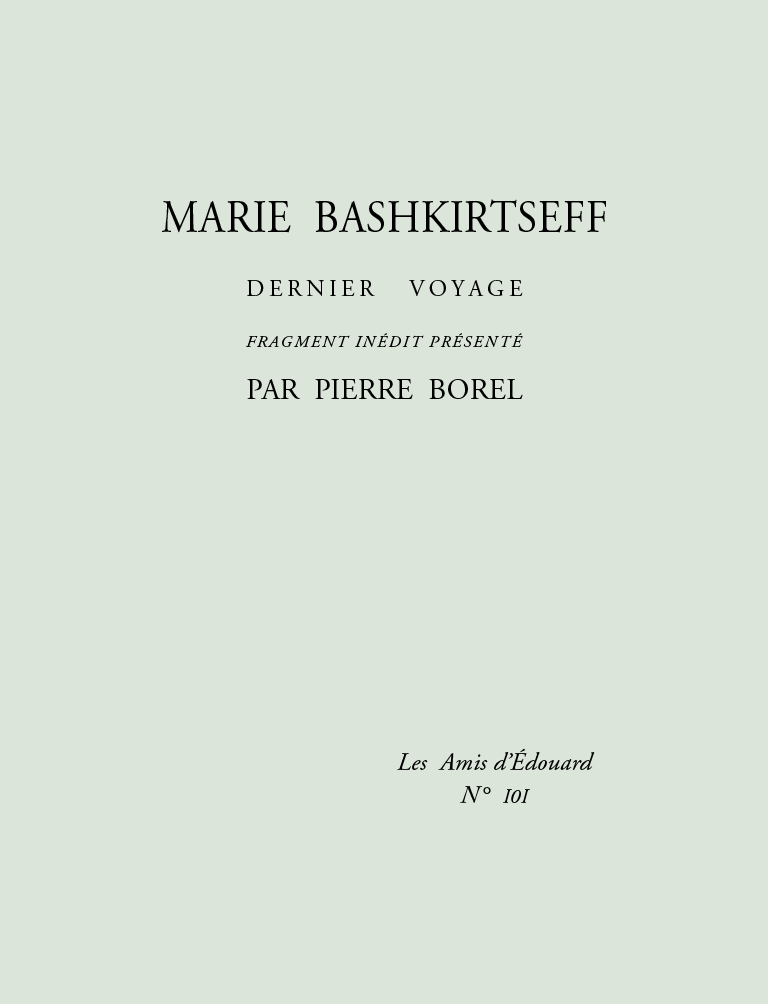 78 Marie Bashkirtseff (1858-1884), née en Ukraine et morte de tuberculose à Paris avant son 26e anniversaire, est surtout connue pour son Journal (Charpentier 1890, deux volumes de 401 et 591 pages) et quelques agréables peintures.