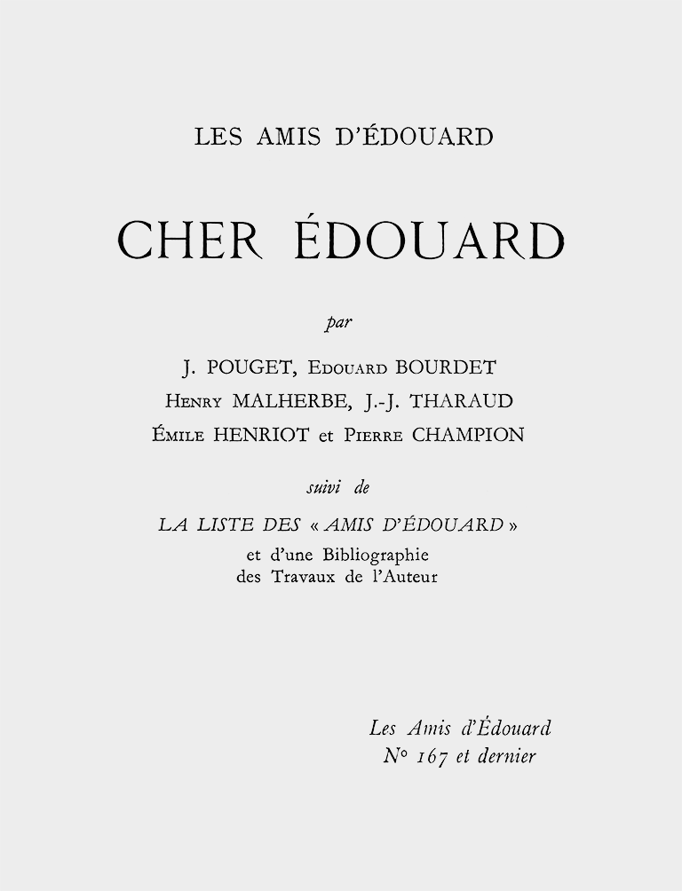 Le dernier titre, Cher Édouard, imprimé en novembre 1938 est un hommage ; Édouard champion était mort neuf mois auparavant, le 27 février. Les 120 pages — un fort volume pour cette collection — renferment les hommages des auteurs dont on peut lire le nom sur la couverture intérieure reproduite ci-dessous.