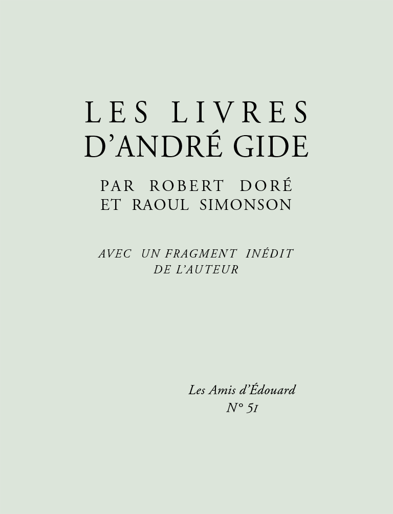 — Le no 51 Les Livres d’André Gide62 est une bibliographie augmentée de quelques extraits de l’auteur, textes qu’on peut dire secrets, tellement est minime le chiffre auquel ils furent tirés : 12 et 13 exemplaires…