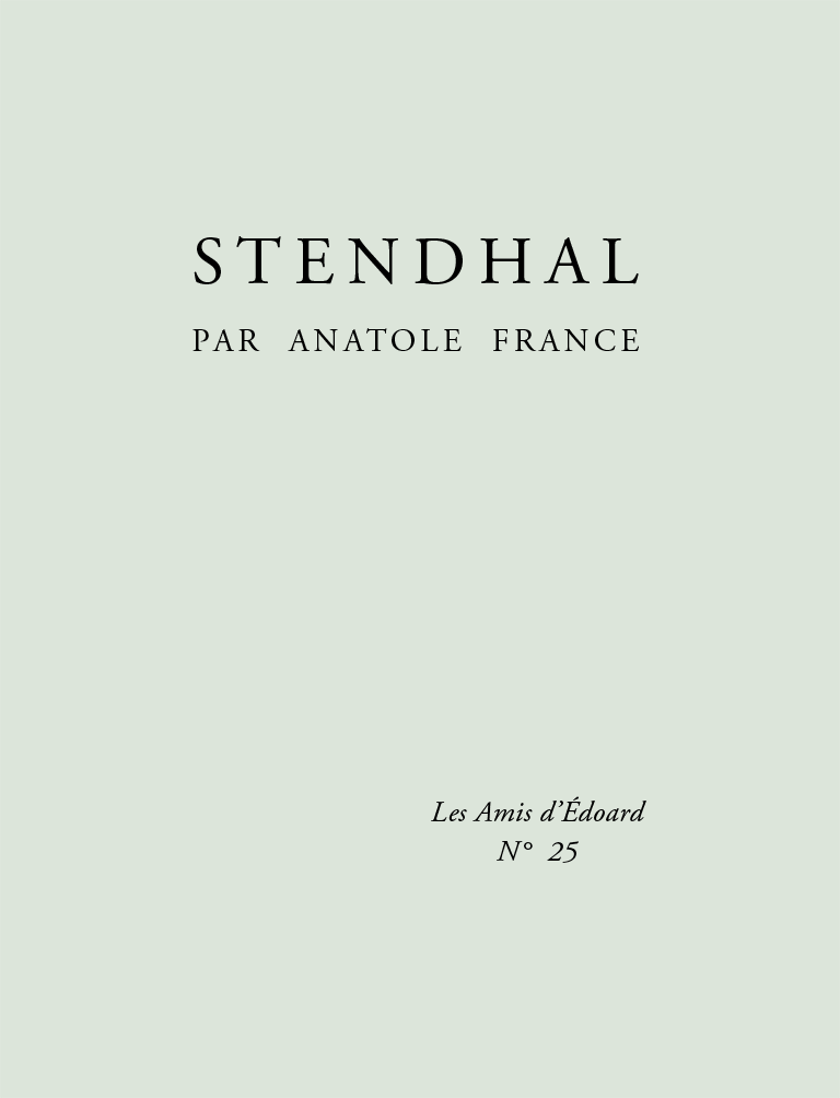 — Il a d’autres attraits et je ne pouvais l’oublier ! J’ai de Paul Bourget qui affectionne spécialement ma collection amicale : Stendhal par un des quarante, réplique de la célèbre brochure de Mérimée65. — J’ai aussi Stendhal d’Anatole France, seul écrit du Maître sur l’auteur de La Chartreuse de Parme. Il fallut mon édition des Œuvres complètes66 (je sais qu’il eut aimé pour ses œuvres à lui une édition de ce genre), et l’inauguration du monument67, que je présidai, pour le décider à considérer un instant Stendhal et à donner un article à La Revue de Paris68 : c’est cet article très corrigé et plein de repentirs que j’ai publié pour mes amis. Il m’est dédié et c’est mon plus beau titre de gloire.