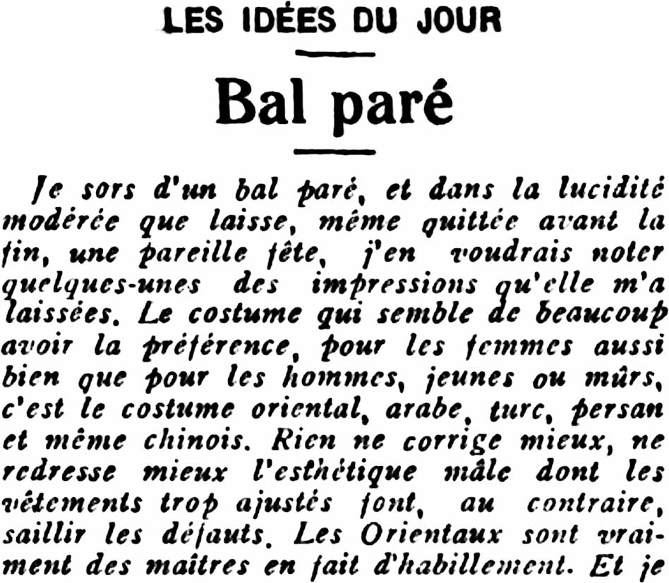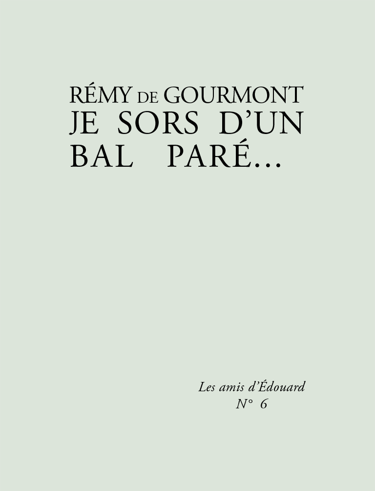 36 Remy de Gourmont (1858-1915), romancier, journaliste et critique d’art, proche des symbolistes, figure majeure du Mercure de France. Paul Léautaud a été son intime. Je sors d’un bal paré… est le numéro six des Amis d’Édouard, daté de février 1912. Voir aussi https://is.gd/xYs6x9.