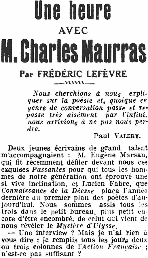 61 « Une heure avec Charles Maurras » en une des Nouvelles littéraires du cinq mai 1923 repris dans le numéro 56 des Amis d’Édouard de décembre 1923. Frédéric Lefèvre (1889-1949) a fait paraître en 1917 son premier ouvrage, au titre ambitieux pour un aussi jeune homme : La jeune poésie française. En 1922, Frédéric Lefèvre, Jacques Guenne et Maurice Martin du Gard ont lancé l’hebdomadaire Les Nouvelles littéraires, revue littéraire « au prix et au format d’un journal » qui paraîtra jusqu’en 1983. Frédéric Lefèvre (1889-1949), sera l’immortel auteur de la série de près de quatre-cents entretiens « une heure avec… » tous parus dans Les Nouvelles littéraires. Certains de ces entretiens seront réunis en cinq volumes chez Gallimard puis (sixième volume) chez Flammarion ente 1924 et 1929.