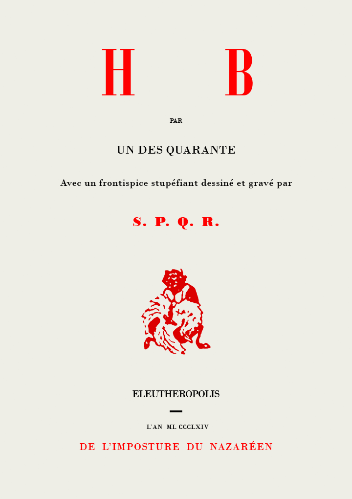 65 Allusion à la plaquette de 36 pages de Prosper Mérimée : H B par un des quarante, « Eleutheropolis, de l’An MLCCCLXIV, de l’Imposture du Nazaréen. [Bruxelles, Poulet-Malassis, 1864] » et un étonnant frontispice de Félicien Rops réservé aux amateurs.