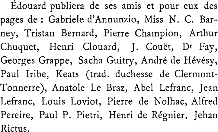 Édouard a beaucoup d’amis : mais l’amitié est une douceur dont l’existence affairée d’aujourd’hui nous laisse peu la jouissance… Édouard l’a senti et pour maintenir des rapports fréquents avec ceux qu’il aime, il a imaginé l’agent de liaison le plus noble et le plus délicat, le plus sympathique et le plus fidèle : le livre. — Il choisit des textes d’amis, les imprime à ses frais, toujours chez le même imprimeur : Paillart d’Abbeville13, ce qui est peut-être le secret de l’unité de tous ces volumes, et les répartit entre ses meilleurs amis. Tout son programme tient dans cette phrase qui se lisait à la fin des premiers numéros : « Édouard publiera de ses amis, et pour eux, des pages de…14 » Près de 80 volumes ont ainsi paru depuis treize ans, et leur collection, privée et rigoureusement hors commerce, fait courir les bibliophiles de la ville et des champs.
