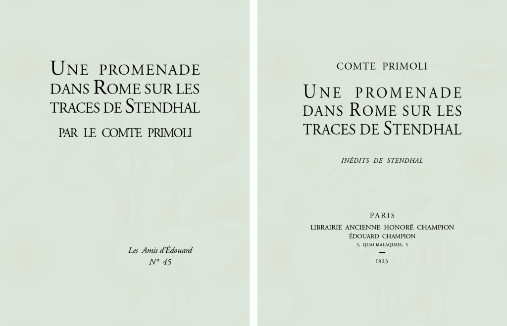 Les deux éditions d’Une promenade dans Rome sur les traces de Stendhal, celle hors-commerce des Amis d’Édouard et celle, commerciale, de la « Librairie ancienne Honoré Champion »
