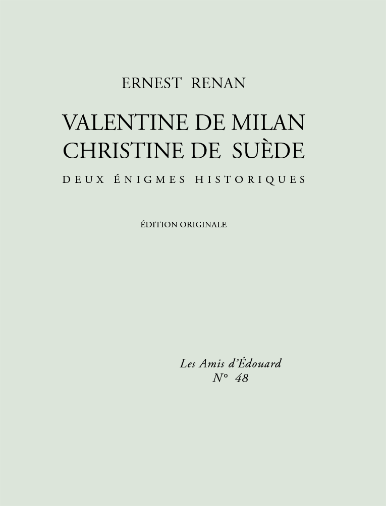 J’ai donné aussi (18) le premier écrit de Renan qui avait paru dans Le Journal des Demoiselles ; il y étudiait deux énigmes historiques : Valentine de Milan et Christine de Suède. J.-J. Brousson24 prit plaisir à démontrer dans Excelsior que Renan avait recopié des phrases entières de la biographie Michaud25.