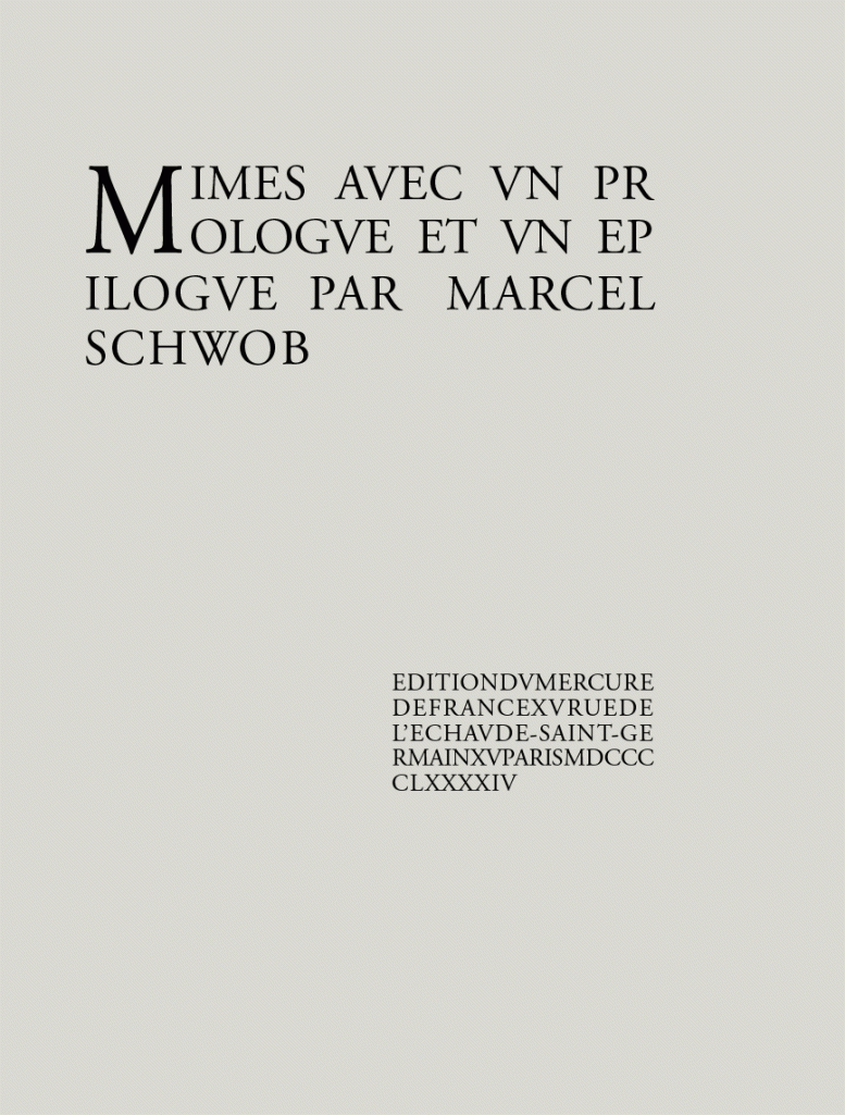 19 Marcel Schwob, Mimes « avec un prologue et un épilogue », dédié à Alphonse Daudet, Mercure 1894, 83 pages. De ces deux ouvrages censés avoir inspiré Édouard Champion c’est à l’évidence ce second qui a été déterminant mais pour le premier peut-être pensait-il à une autre édition que l’originale de 1896 ?
