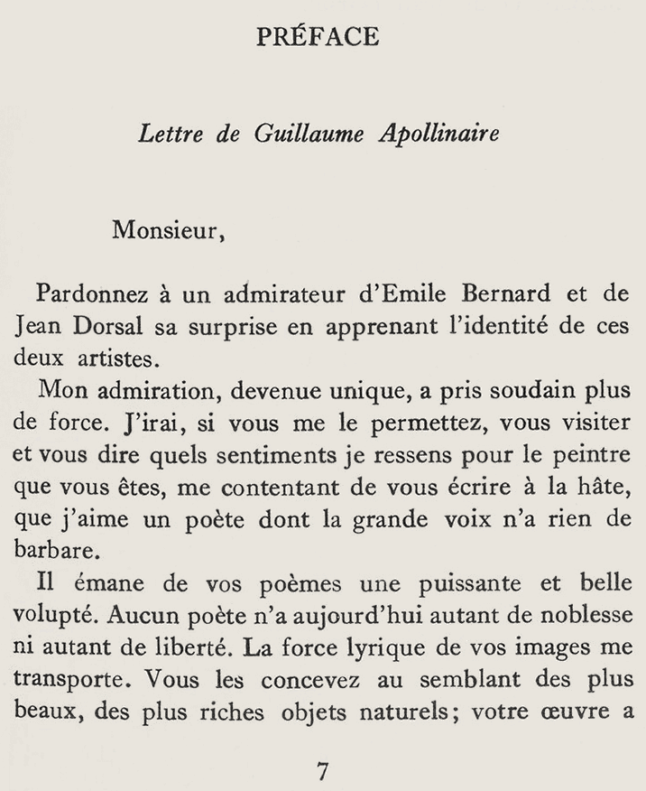 Auriant me raconte qu’il y a une petite soirée demain, chez Émile Bernard, à laquelle il est invité avec Mandin. Soirée donnée par Bernard uniquement pour leur lire ses vers. Auriant me dit qu’il en écrit énormément et qu’il ne peut pas se trouver chez lui, ou même le rencontrer dehors, sans qu’il se mette aussitôt à lui en lire, « et c’est long » dit Auriant. Auriant lui parlant l’autre jour de Guy-Charles Cros58, Bernard a eu un mouvement de dédain : « Cela ne compte pas, ce n’est pas un poète. » Auriant lui a opposé en vain la fantaisie charmante de Cros. Bernard fait grand état et parle à tout instant de la lettre que lui a écrite un jour Apollinaire : « Vous êtes un grand poète. » Auriant dit avec raison qu’il ne devrait pas aimer du tout les vers d’Apollinaire, mais le fait d’avoir été traité par lui de grand poète change tout.