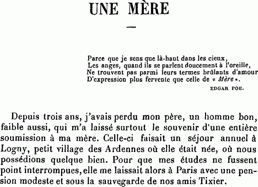 Je ne sais pourquoi elle me parle à chacune de ses visites de sa vie difficile, tout à fait difficile… Elle est pourtant fort bien mise. Mais les femmes savent se mettre fort bien, tout en étant fort gênées, en prenant soin de leurs affaires, en les arrangeant, en les transformant… Elle parle aussi de sa solitude morale…