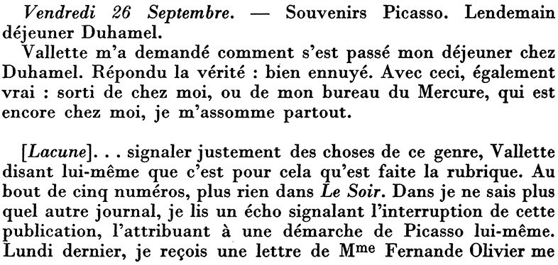 Tantôt visite de Mme Fernande Olivier, désireuse de connaître la réponse de Gallimard pour son volume. Je lui ai dit que je verrai Gallimard après-demain (réunion des amis de la N.R.F. pour laquelle j’ai reçu une invitation ce matin) et que je lui demanderai ce qu’il décide. Elle reviendra lundi à 3 heures.