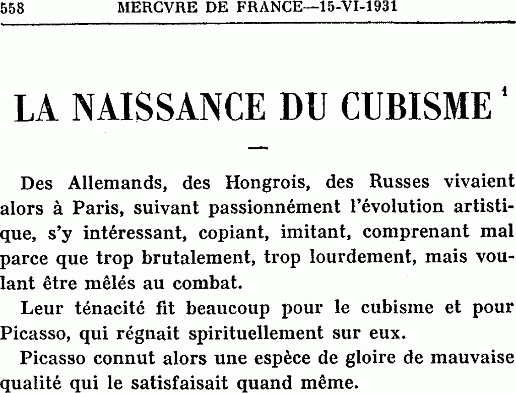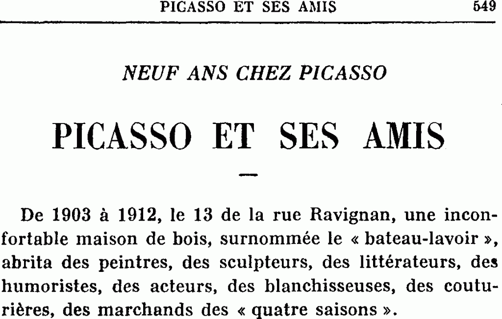 « Un journal du soir avait commencé la publication des souvenirs de Mme Fernande Olivier, sous ce titre : Quand Picasso était pompier. Le feuilleton a été brutalement interrompu. Est-ce la conséquence des bandes de Hitler […]