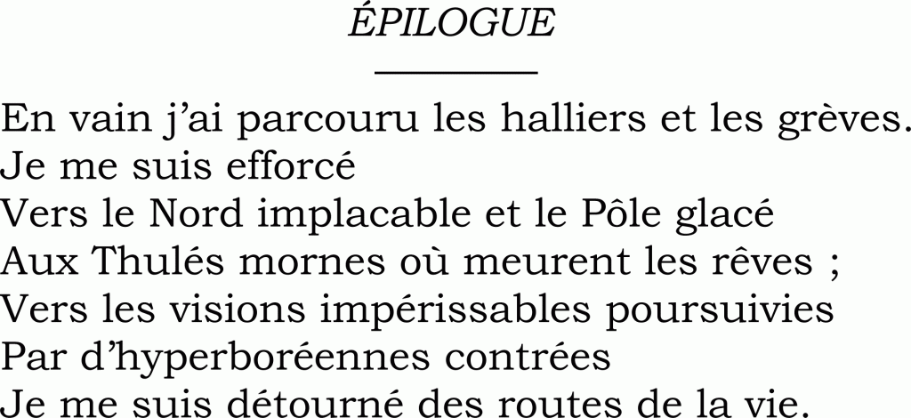 Quand Fontainas m’eut dit, après ma lecture, qu’il trouvait ce poème très beau, je lui ai dit : « C’est aussi mon avis. Je le trouve aussi très beau. Eh ! bien, quelqu’un à qui je l’ai montré, n’a pas été de cet avis. (Je n’ai pas nommé Montfort45.) Cela m’a rendu perplexe sur mon jugement, mais ce matin, je me suis rappelé l’histoire du poème d’Apollinaire. La Chanson du Mal-aimé n’a pas cessé d’être considérée comme un très beau poème46. Je sais donc fort bien ce que c’est que de beaux vers. Je suis enchanté de voir que vous êtes de mon avis pour celui-ci. »