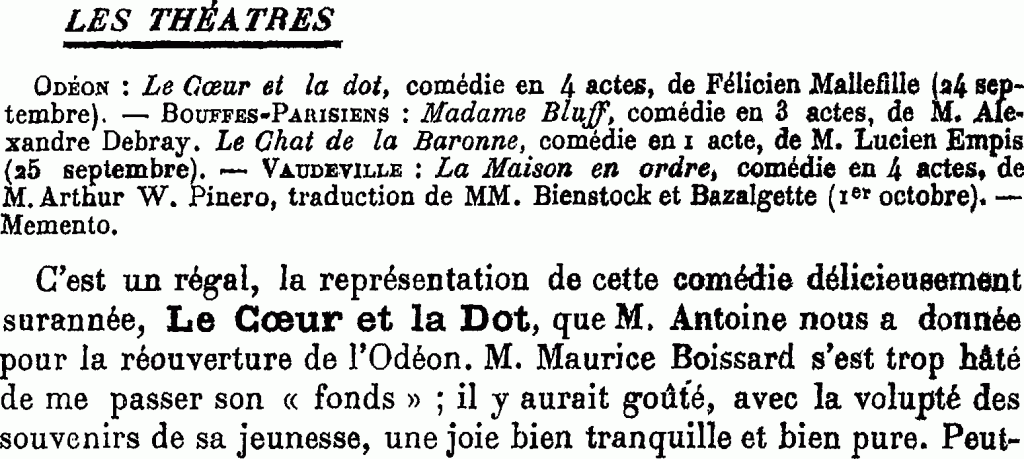 Cette première chronique d’André Fontainas paraîtra dans le numéro du seize octobre, page 718. La première pièce chroniquée est Le Cœur et la dot, comédie en quatre actes, de Félicien Mallefille23, représentée à l’Odéon le 24 septembre. Ainsi qu’est l’usage, en ouverture de sa première chronique, André Fontainas évoque son prédécesseur :