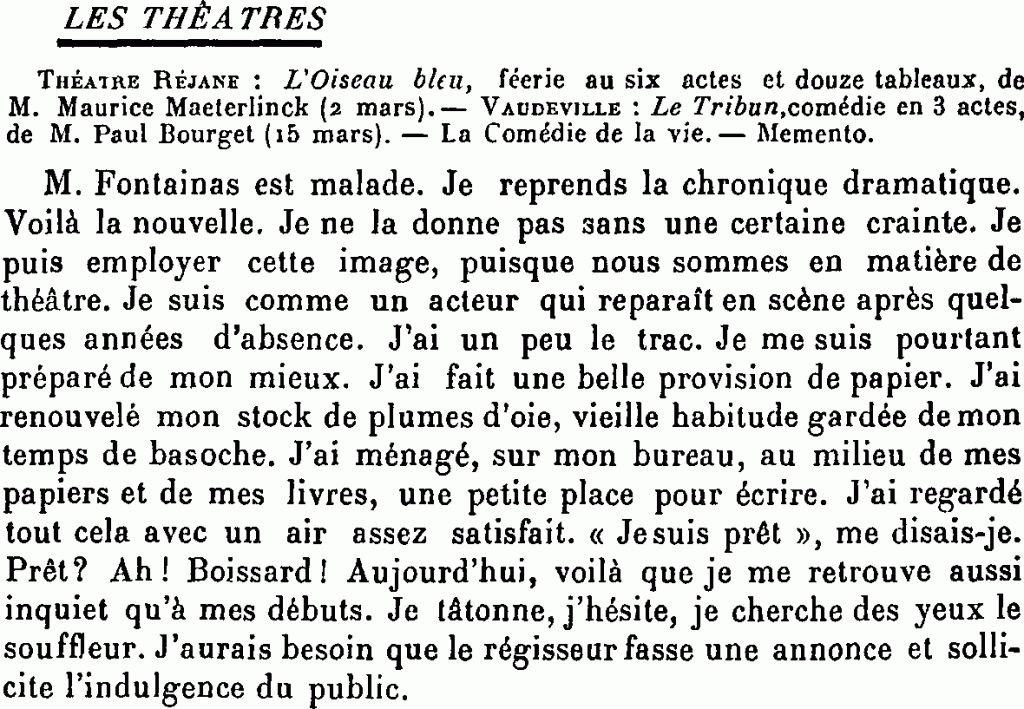 Je commence demain soir avec le Théâtre Réjane : L’Oiseau bleu36, de Maeterlinck. Fontainas n’a pu y aller le jour du service de seconde. Il en avait informé Maeterlinck, lui demandant d’autres places, pensant être rétabli. C’est moi qui en hérite.