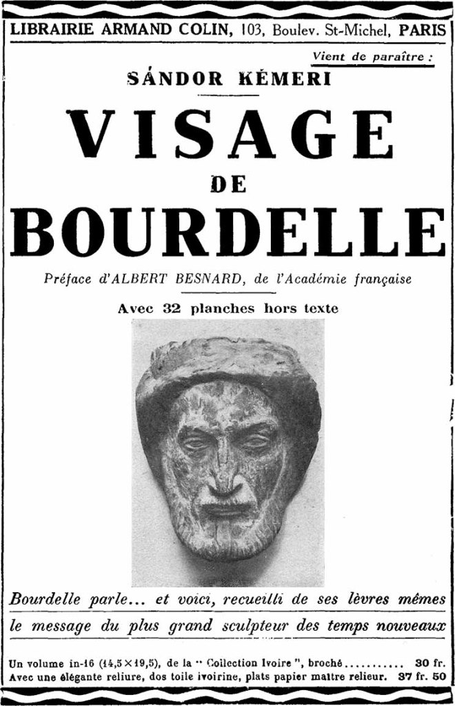 55 « Le Visage de Bourdelle » (le mot vrai ne figure pas dans le titre). Mercure du quinze février, pages 82-92. Coïncidence ?, dans les pages de publicité au début du numéro, une annonce de la librairie Armand Colin : Sándor Krémeri, Le Visage de Bourdelle, préface d’Albert Besnard.
