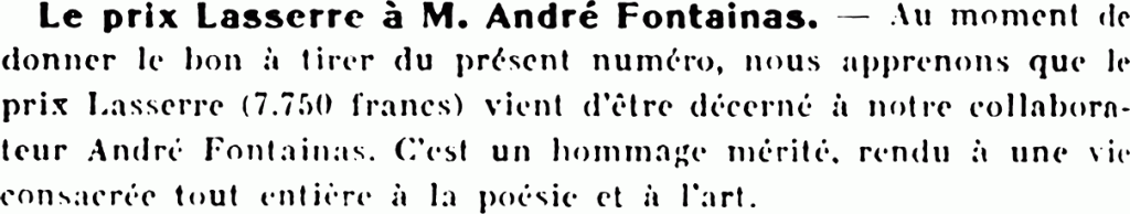 Nouvelle lumière sur le silence de Fontainas. J’ai parlé ce matin à Mandin. Il s’écrie : « Parbleu ! Il s’est fait pistonner par Duhamel pour le Prix Lasserre, qui lui a été décerné hier. Et en effet, je vois dans les journaux : Prix Lasserre70, décerné par le ministère de l’Éducation nationale, 7 500 francs, à M. André Fontainas. Ce malheureux, qui se vend pour 7 500 francs ! Et s’il était pauvre, encore. Mais non ! Il avait un poste assez élevé à l’Octroi de Paris. Il est à la retraite. Et une retraite qui ne doit pas être la misère, tout de même.