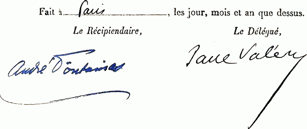 Signatures d’André Fontainas et de Paul Valéry côte à côte sur le procès-verbal de réception de chevalier de la légion d’honneur daté du quinze octobre 1936