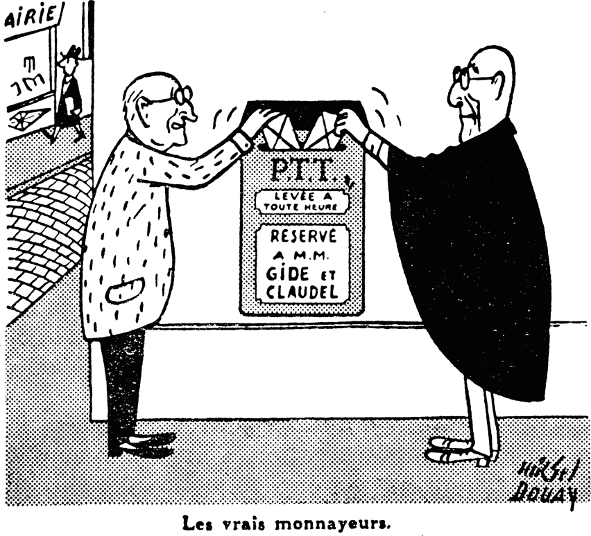 Ce matin, lettre de Jean Denoël. Il m’envoie cette caricature parue sur Gide et Claudel à propos de la publication de leur Correspondance285. Le plus drôle, c’est que tous deux sont ressemblants. Comme je le réponds à Denoël, elle mérite d’être conservée, et je la colle dans mon Journal. Moyen qui y aidera peut-être. Il me dit qu’il va de temps en temps voir le Reclus de la rue de Seine (Rouveyre), qui est furieux contre Gide qui ne veut rien entendre pour la publication de leur correspondance.