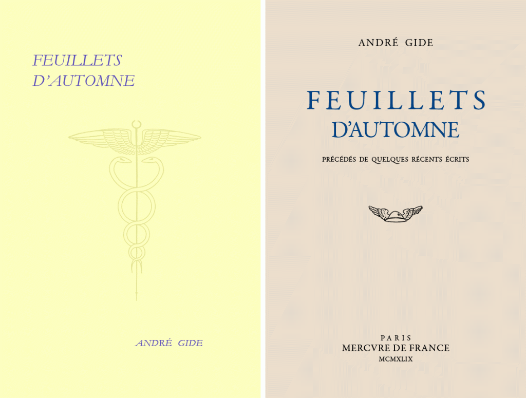 274 André Gide, Feuillets d’automne, Mercure de France 1949, 283 pages. Ces Feuillets d’automne ne devront pas être confondus avec le texte placé à la suite de l’année 1947 du Journal, qui ne représente que six pages de Pléiade.