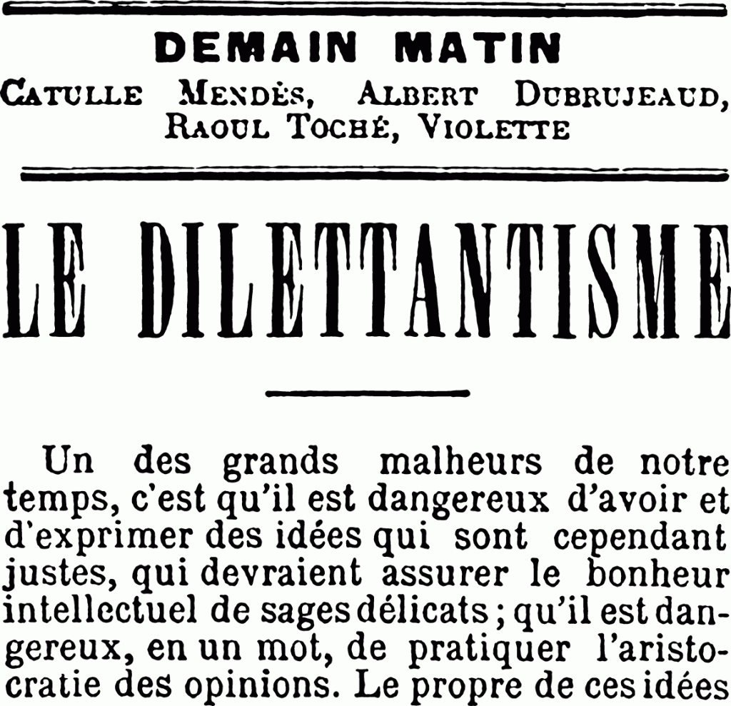 « Ce dilemme n’a rien de subversif ; il est simplement imbus du bon sens français, cette vertu dont on parle toujours et qu’on n’éprouve jamais… La vision de M. de Gourmont est plus sensée certainement, et plus noble je crois, que celle de M. Déroulède18. »